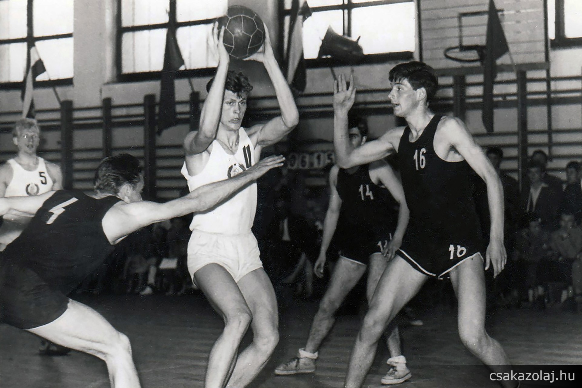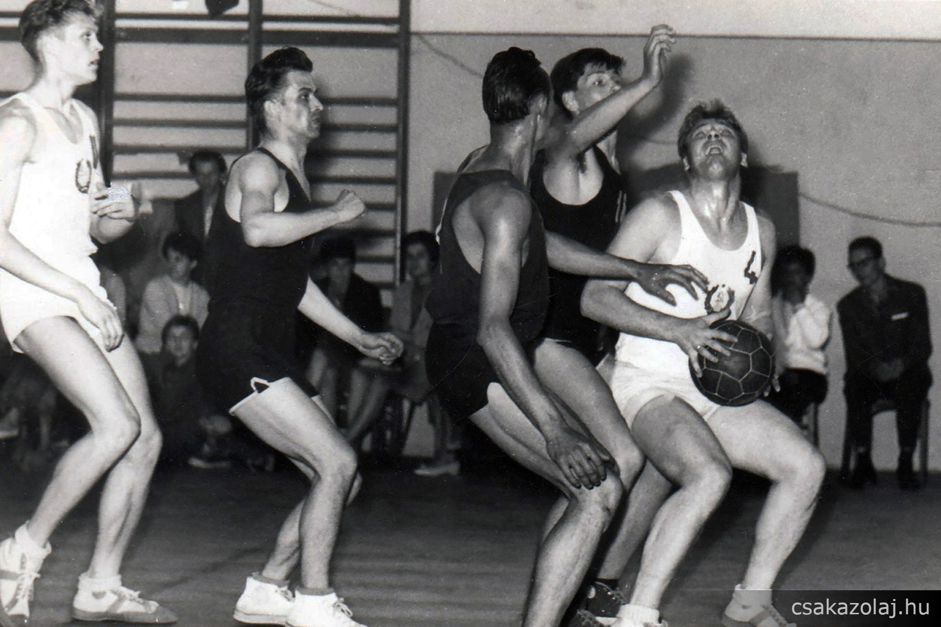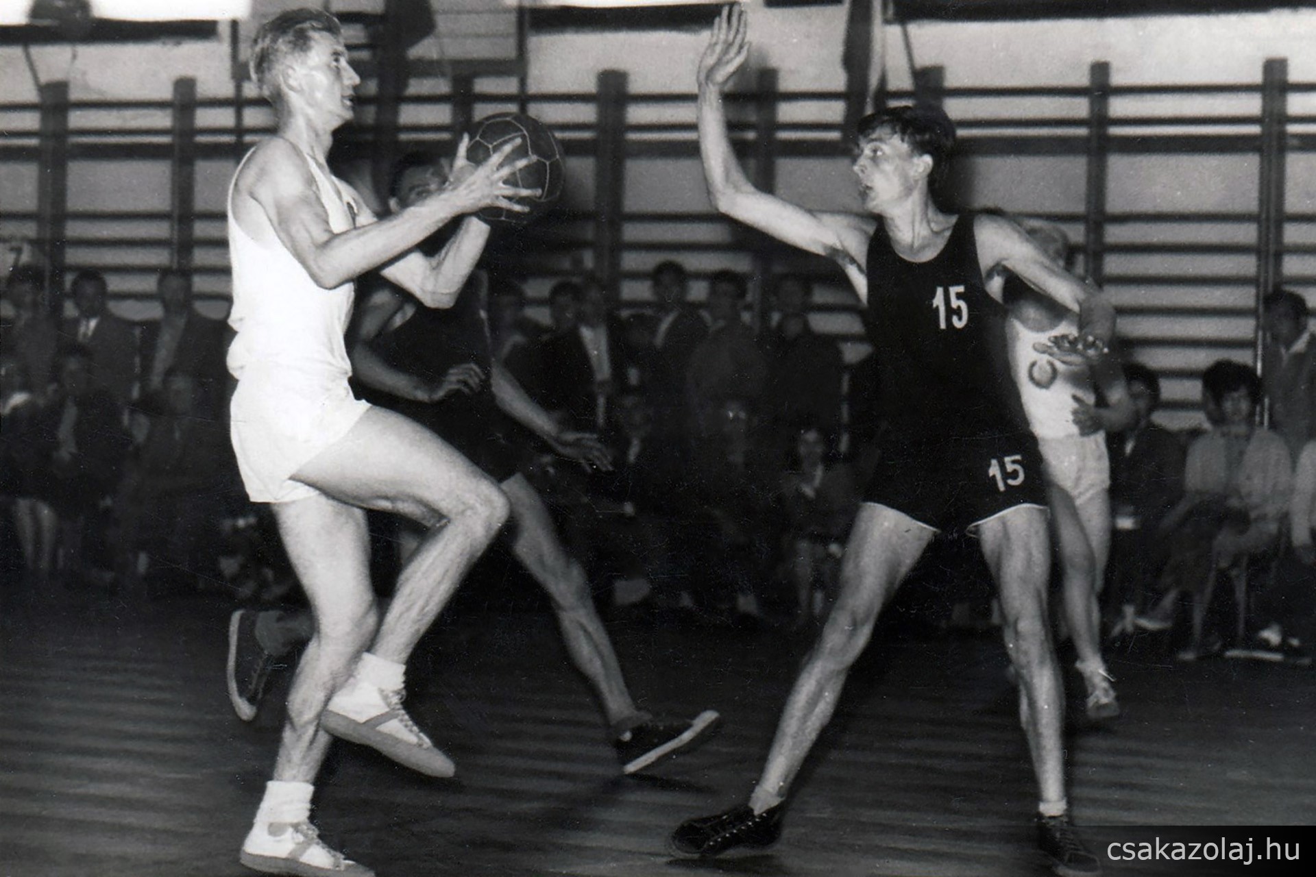 1962. június 2-án került sor az első nemzetközi szereplésre. A vendég az Észt válogatott volt. Kikaptunk 73-17-re, de nagy élmény volt. A képen fehérben az észtek, sötét 4-es Suba Sándor, 16-os Acsay Attila, 14-es Balogh Gyula. Helyszín a Közgazdasági Technikum tornaterme. A játékot ekkor még bőr labdával játszottuk